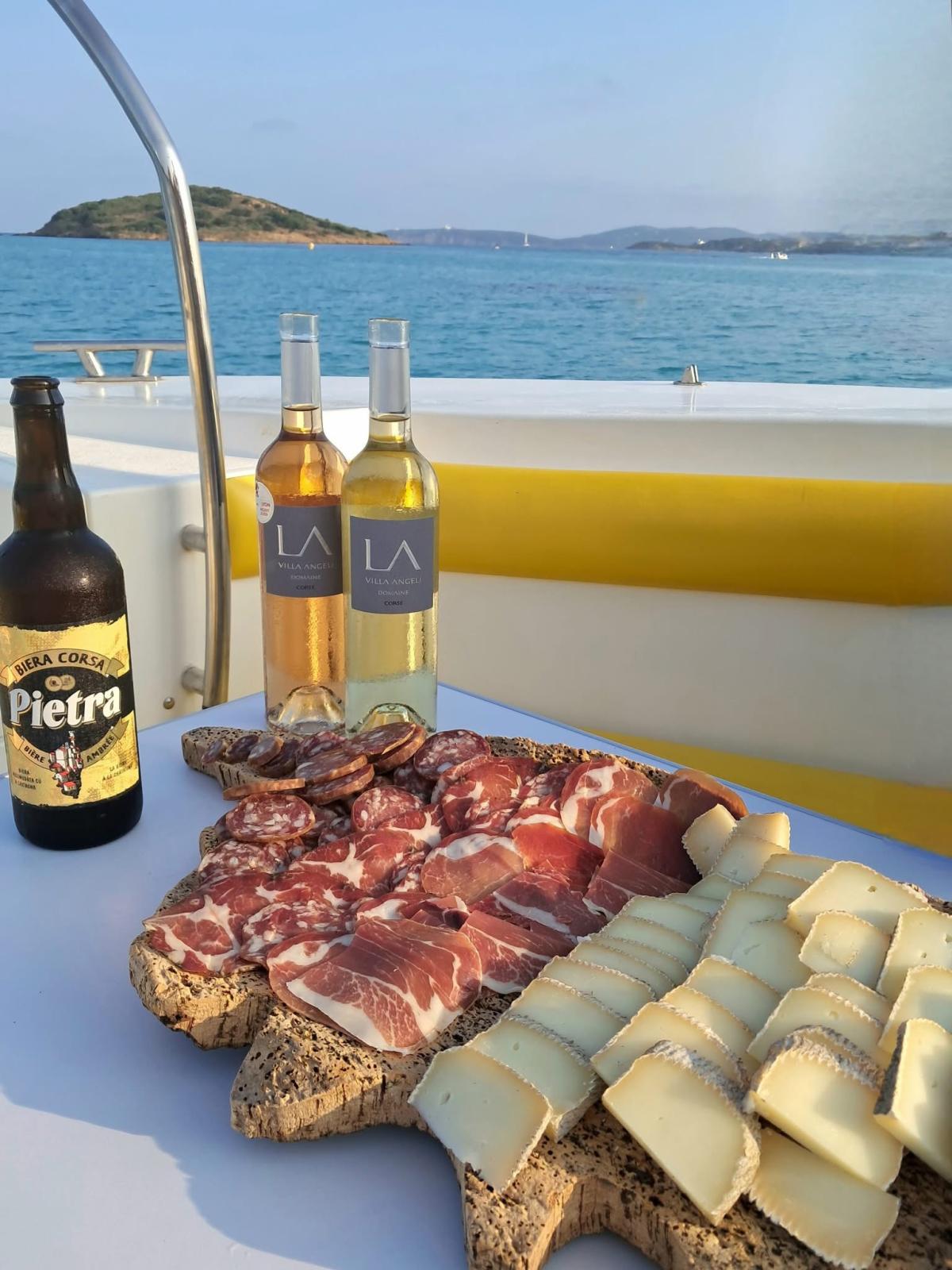 À bord, un apéritif corse vous est servi : charcuterie, fromage, bière et vin local, pour savourer pleinement ce moment hors du temps, en petit comité.